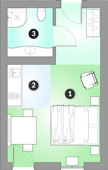 • w apartamencie znajduje się:  część sypialna, łazienka, kącik jadalny połączony z aneksem kuchennym,