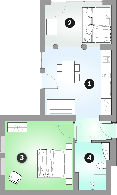- jednopoziomowy, czteroosobowy apartament o powierzchni ponad 55m²,