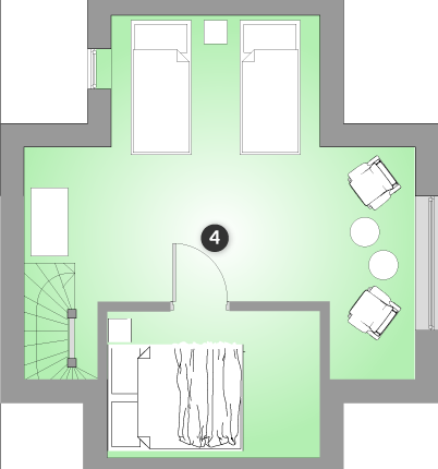 • na drugim poziomie sypialnie z dwoma pojedynczymi łóżkami oraz osobna sypialnia z podwójnym łóżkiem,