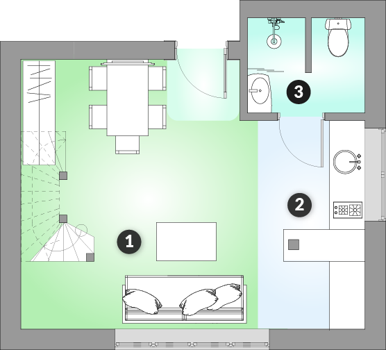 • w apartamencie znajdują się: wyodrębniona strefa do spania oraz wypoczynku, kącik jadalny połączony z  aneksem kuchennym , łazienka z oknem,