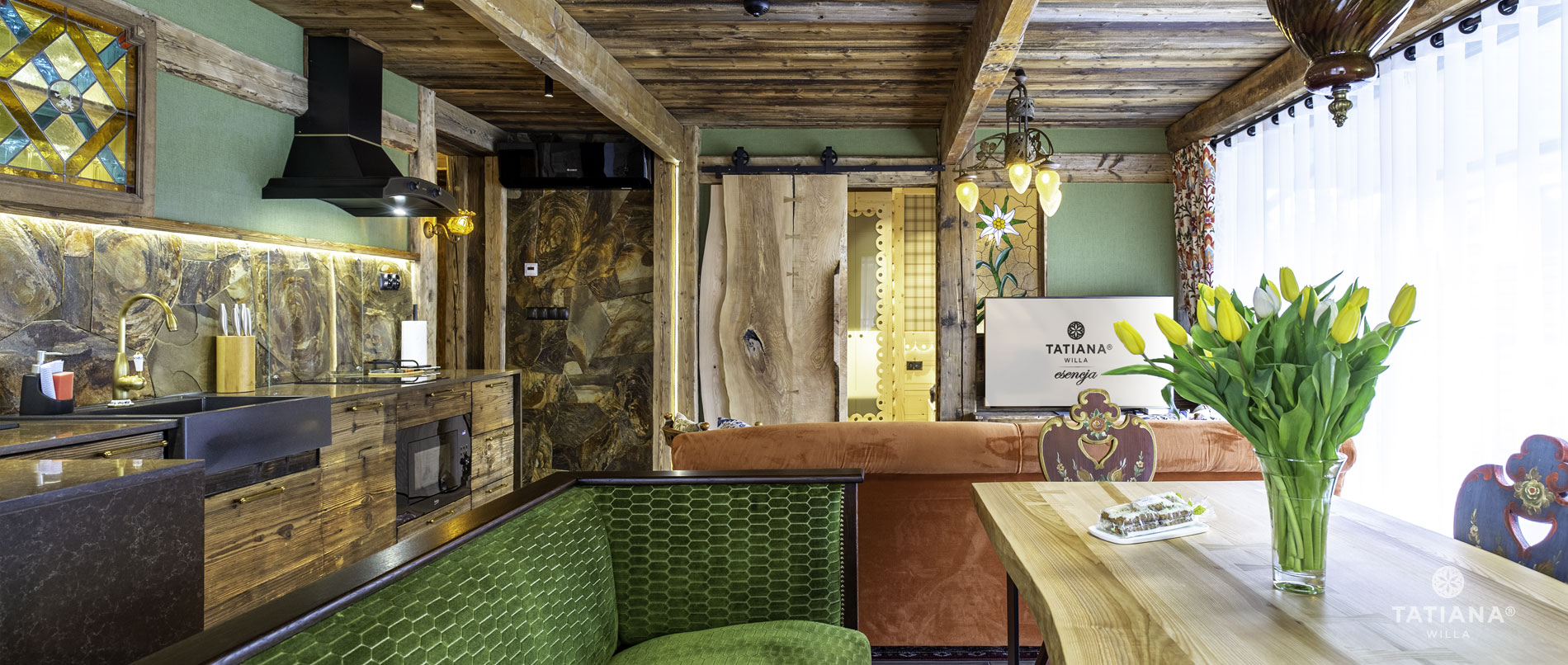 Apartament boutique, łączy w sobie stylowe, tradycyjne elementy Podhala z nowoczesnym designem i komfortem. Inspirowany klimatem willa TATIANA boutique.