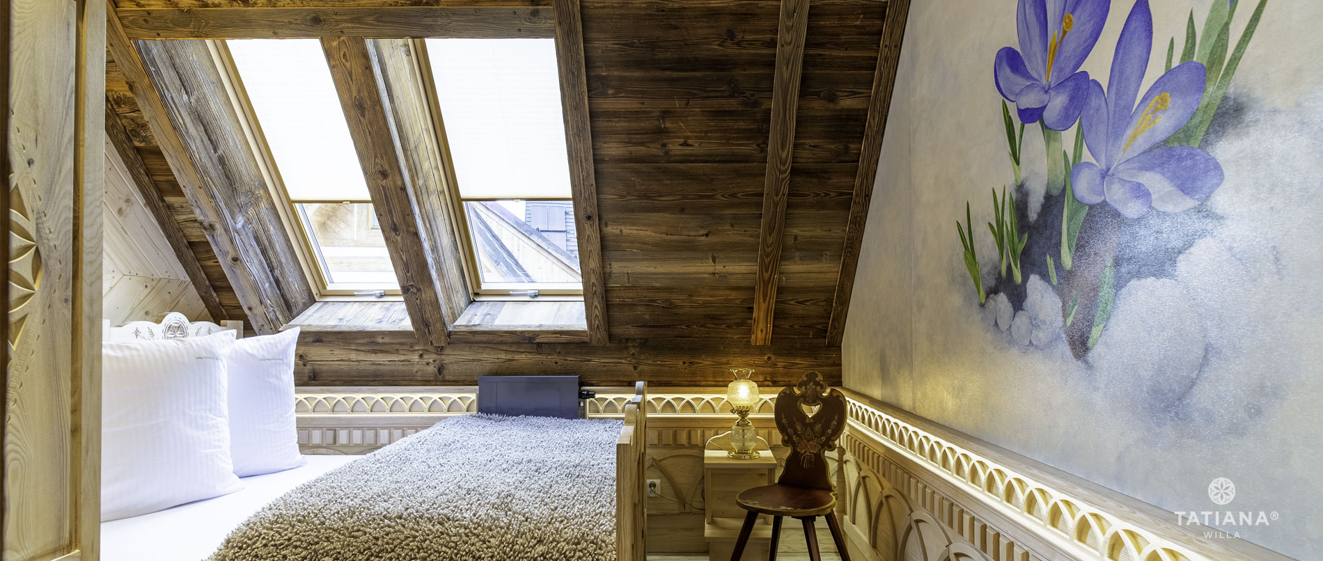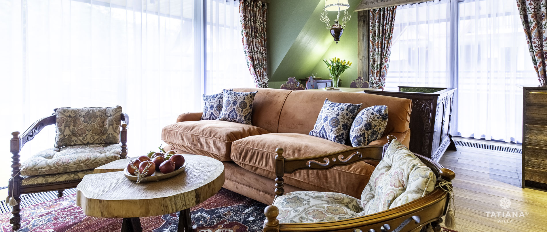 Zapraszamy do apartamentu, zainspirowanego stylem willa Tatiana Lux, która jest kwintesencją stylu Podhalańskiego z nutą rustykalnego klimatu. Wykorzystanie żywej kolorystyki tkanin oraz piękno modrzewia, które nadaje wnętrzu ciepły klimat, zostały wzbogacone drewnem, rosnącym wprost w apartamencie.