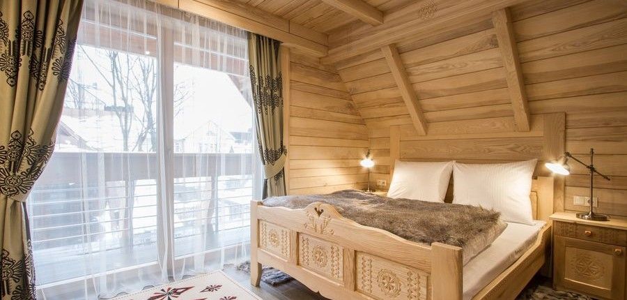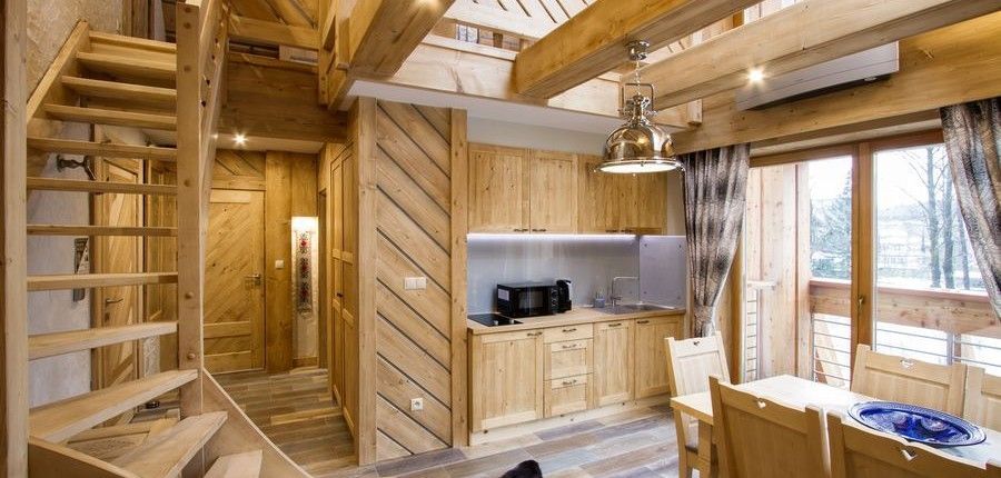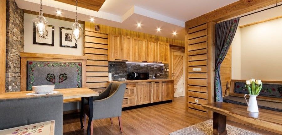 W jego aranżacji użyto drewna ze starych, ponad 100-letnich chałup góralskich. Dzięki wykorzystaniu wiekowego drewna apartament urzeka niesamowicie ciepłą kolorystyką. Uzupełnienie wystroju stanowią piękne ręcznie tworzone meble, oraz niepowtarzalne charakterystyczne dla Podhala zdobienia.