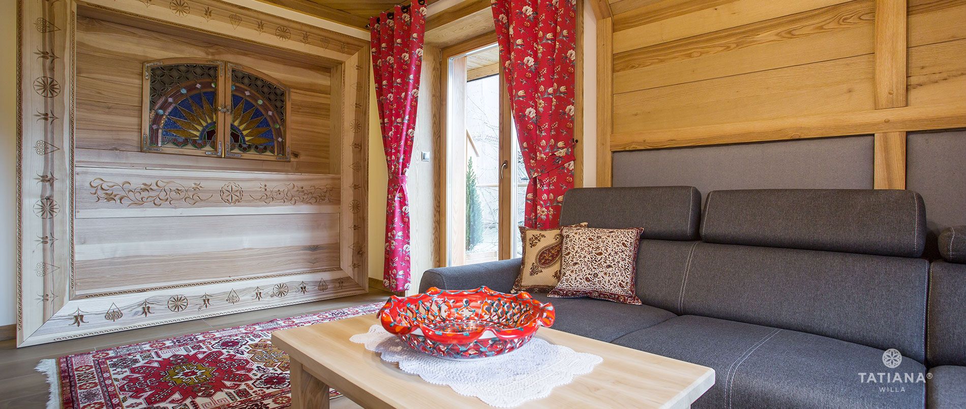 Pełen jest kwintesencji góralskiej tradycji stolarstwa jakie możecie Państwo zobaczyć na całym Podhalu. Ręczne rzeźbienia nawiązują do wiekowej tradycji przekazywanej z pokolenia na pokolenie z wykorzystaniem nowoczesnych form góralskiego zdobnictwa. Żywe charakterystyczne kolory tego regionu, kunszt kowalstwa oraz piękno drewna składają się na wystrój tego apartamentu i tworzą jego niepowtarzalny klimat.
