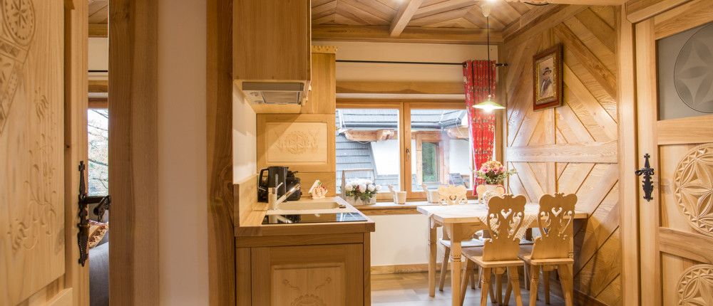 It is a quintessence of highlander woodwork tradition found in the Podhale region. Handmade carvings combine the centuries-old tradition passed from generation to generation with modern forms of highlander ornamentation. Characteristic vivid colours of the region, blacksmithing craftsmanship and the beauty of the wood make up the decoration and unique atmosphere of the apartment.